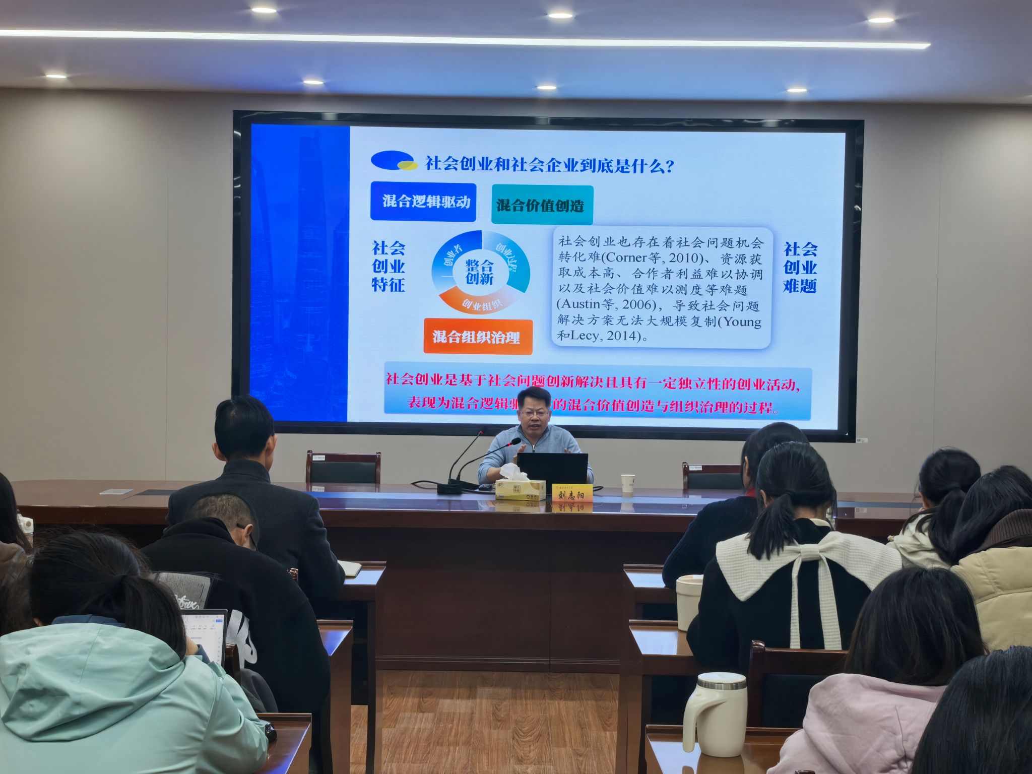 会议伊始,万绪才院长对刘志阳教授的到来表示热烈欢迎,并介绍了其学术背景与研究成果。讲座中,刘志阳教授从社会创业的研究脉络与发展趋势切入,系统阐述了新时代背景下社会创业的理论内涵与实践意义。他围绕“社会创业是否等同于商业创业的社会化应用”“AI对社会创业的影响是否仅为技术延伸”等问题展开探讨,重点剖析了社会创业领域在概念界定、价值衡量、创新本质等十二个方面的理论分歧,并结合国内外前沿成果,指出该领域的发展趋势与研究热点。刘教授强调,社会创业是推动社会创新、实现可持续发展的关键力量。随后,他详细介绍了资源动员、混合治理、价值共创等核心理论框架,并分享了社会企业成长的实际案例与研究方法。