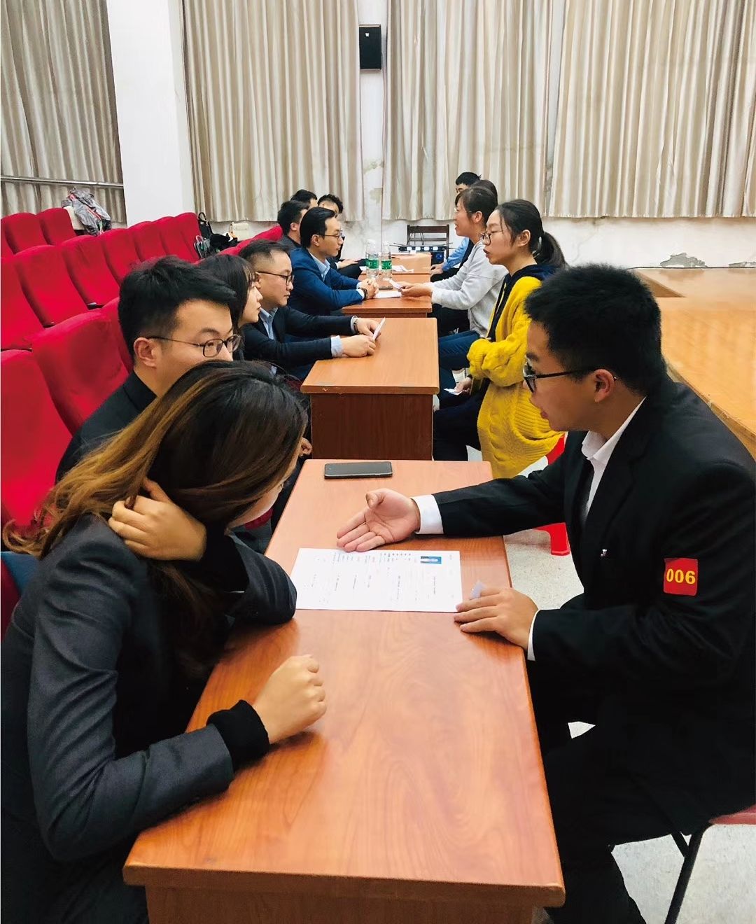 此次招聘会共有四个环节。首先,李培筠先生介绍融信概括、文化以及“信之翼”校招项目等相关的详细内容。其次,校友姜超进行了2018届“信之翼”项目培养过程进行了详细的分享。接下来,是互动答疑环节。由学生提问,融信集团校招团队进行答疑。此环节,融信集团发放了五张面试直通卡。最后一个环节,是现场接受简历并分组进行了面试。招聘会现场设置了一等奖最新款iPhone11,二等奖小米平衡车,三等奖华为运动手环的现场抽奖。