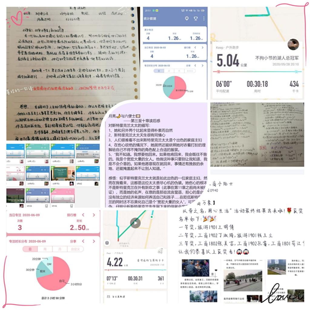此次活动共分为四个板块,第一个板块是“以劳强体,健康生活”运动打卡,同学们每天集中在早上6点至8点和晚上7点至9点两个时间段通过运动APP记录户外跑步的时长和轨迹,将运动截图上传到QQ群打卡,该活动不仅增强了同学们的免疫力,也锻炼了大家顽强拼搏的精神意志。第二个板块是“以劳润美,用心生活”主题摄影,活动通过用一组组照片记录骄阳下挥洒汗水的奋斗者们,将疫情过后各行各业热爱劳动、热爱生活、积极复产复工,努力工作的精神面貌展现得淋漓尽致,让同学们在潜移默化中树立信心,肩负起新时代新青年的责任。第三个板块是“以劳为先,抚案留香”读书交流,同学们通过线上投票选择了《月亮与六便士》和《生活明朗,万物可爱》这两本书作为阅读书目,于5月28日与6月4日晚进群分享读书笔记、并针对两本书的主题思想与写作手法等进行交流,碰撞思维的火花,释放内心的压抑,在积极的读书氛围中携手努力,共同抗疫。第四个板块是“以劳强学,入乎其内”学习打卡,通过番茄等自习APP记录自习时长,每天将自习时长截图与相应学习内容图片上传至群相册,互相监督,充分利用课余时间来巩固课上已学知识点,以正确的方式与积极的心态面对当下的学习。