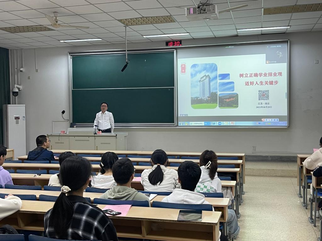 仙林校区德正楼116教室作了题为“树立正确学业择业观,迈好人生关键步”的主题讲座,讲座由学工办邱祥霞老师主持,旅游管理专业2021级全体新生参加了此次讲座。