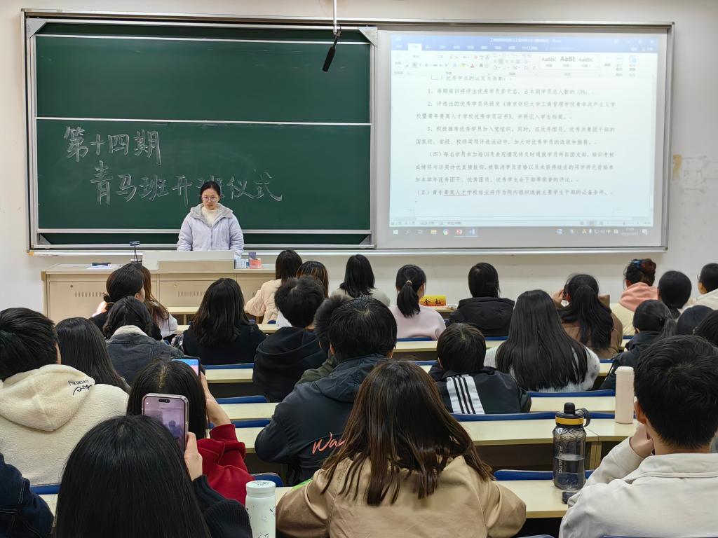 第十四期青马班纪律及注意事项,并从课程设置、考核管理、纪律管理等方面进行详细介绍,以便更好地规范学员们的行为。接着,第十三期青马班优秀学员代表人资2201班王艺锦同学发言。他表示,青年兴则国兴,青年强则国强,作为新时代的青年,要有理想、有担当,要提高自己的政治素养,加强自己的科学文化素质,为祖国和社会贡献自己的力量。