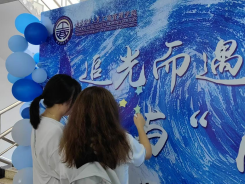 办理完宿舍相关手续后,新生们前往德济楼四楼大厅进行报到注册。走出四楼电梯口,首先映入眼帘的是“激扬青春 逐光而行”成人动漫