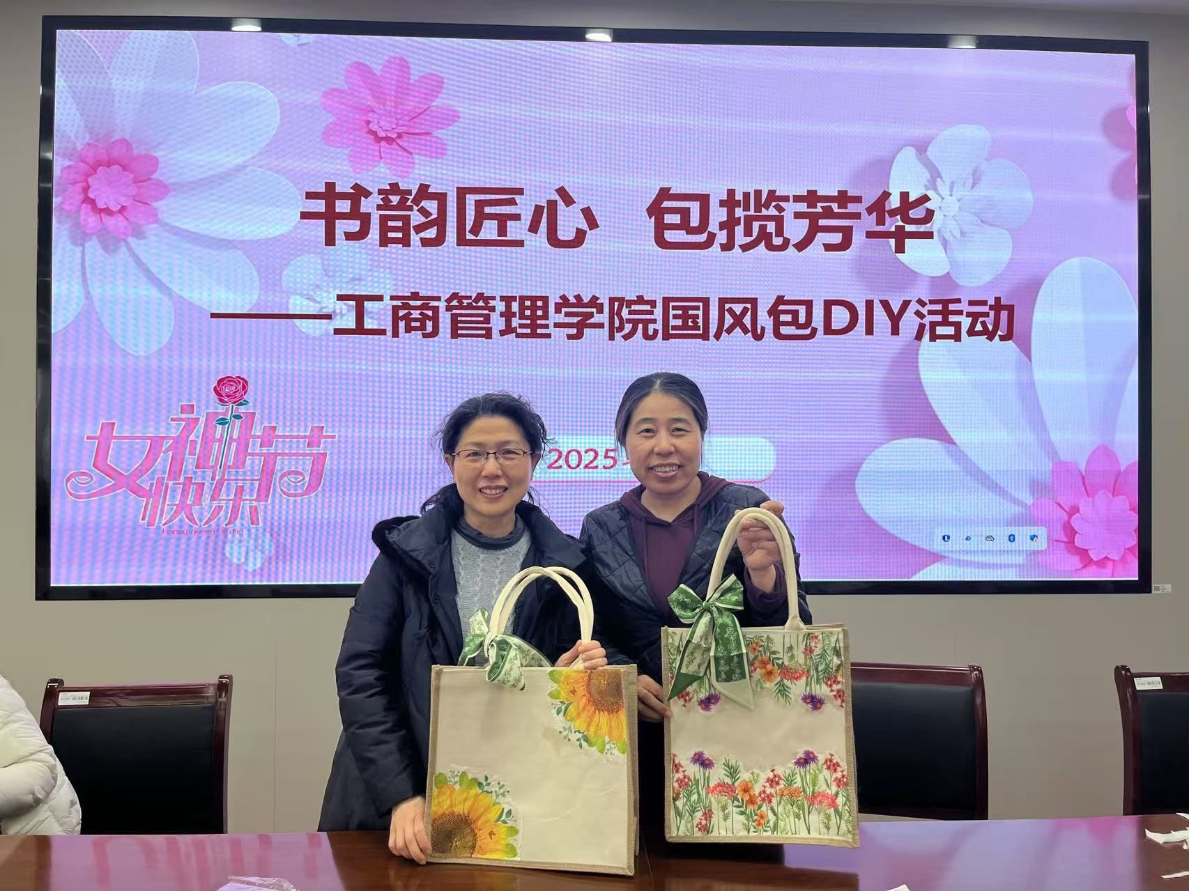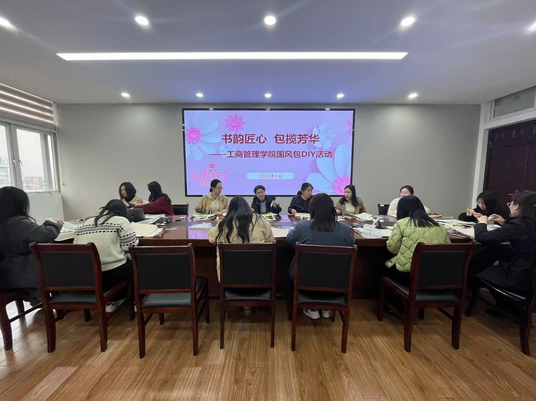 3月5日,学院在德济楼408室举办"书韵匠心包揽芳华"国风包DIY活动。党委书记张杰、副书记尹海燕与女教师、少数民族学生代表共同参与传统手工艺实践。活动通过视频教学展现古风刺绣技法与纹样寓意,参与者在一针一线的创作中,将少数民族文化元素与古典审美相融合,制作出兼具实用性与艺术性的国风包。张杰书记在致辞中充分肯定女教职工的育人贡献,强调传统文化传承对师德建设的滋养作用。
