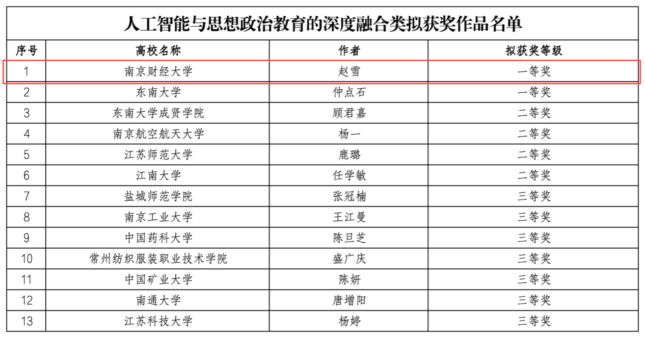 赵雪老师创作的作品《“三基”铸魂 数智报国——AI赋能新时代财经青年的使命答卷》在“人工智能与思想政治教育的深度融合”类别中荣获一等奖第一名。