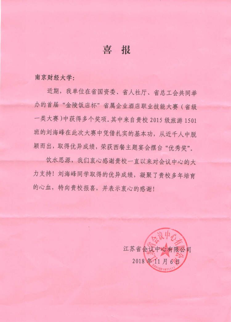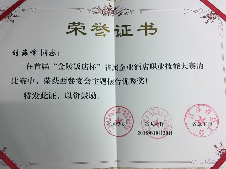首届“金陵饭店杯”省属企业酒店职业技能大赛是省级一类大赛,大赛设中餐烹饪、西餐烹饪、烘焙等6个竞赛项目,经过第一轮的选拔,共有来自43家酒店的200余选手进入决赛。正在钟山宾馆进行集中毕业实习的刘海峰同学在此次大赛中凭借扎实的基本功,从近千人参赛选手当中脱颖而出,并取得了优异的成绩。