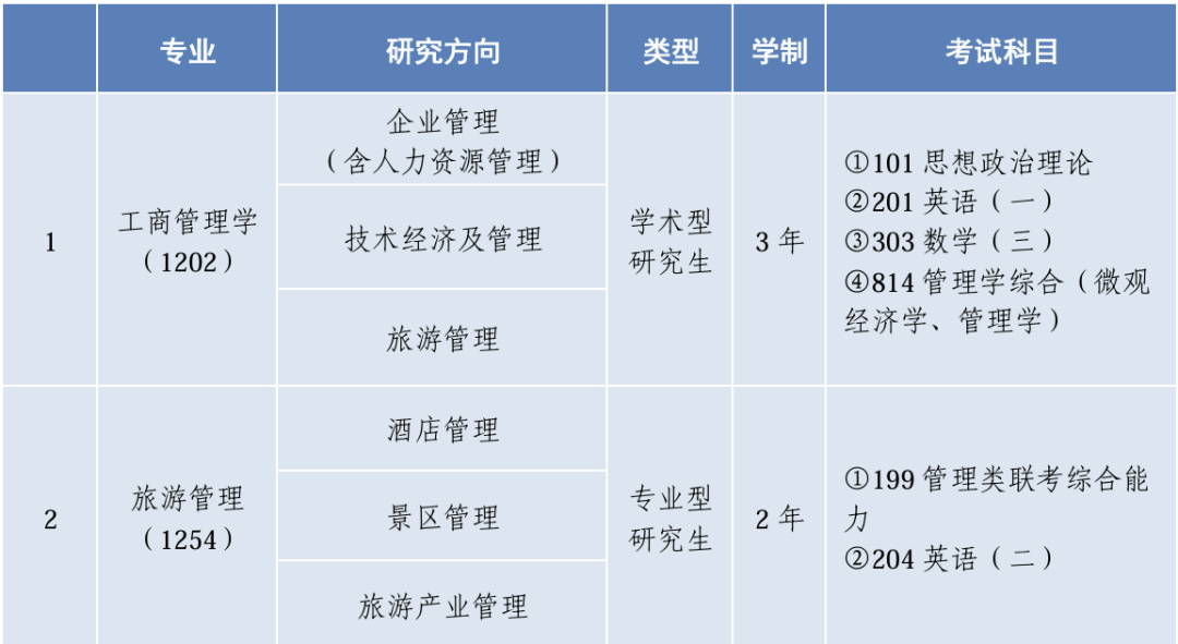 2026年硕士研究生招生专业共2个:120200工商管理学和125400旅游管理(MTA),欢迎广大考生报考和咨询。
