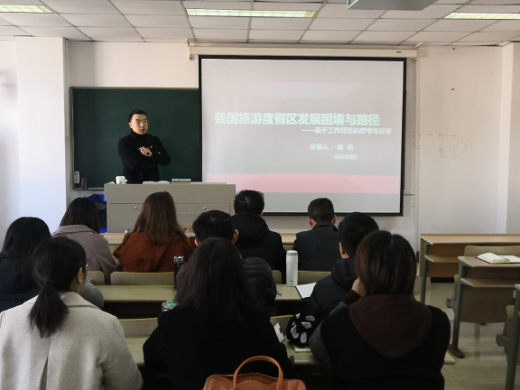 2019年12月7日上午,应成人动漫 邀请,江苏景和睿策旅游规划设计研究院有限公司总经理储光博士在仙林校区博文楼414教室作了题为“我国旅游度假区发展困境与路径”的学术讲座。讲座由彭红松博士主持,旅游管理专业部分本科生、硕士生和教师聆听了讲座。