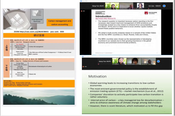研讨会上,来自于Western Sydney University的Q.L.Tang教授作为Key Speaker做了“Carbon risk management”的主题报告。来自于Macquarie University的高级讲师Laura Luo做了“Value Relevance of Firm Carbon Transparency”的论文报告,来自于University of Western Australia的George Shan教授和Murdoch University的Alex Zhang老师做了“Determinants of internal price of carbon”的论文报告,来自于Western Sydney University的Ruby Fan博士做了“Climate risk”的文献报告。参加本次线上研讨会的还有来自于University of Sydney,University of Wollongong,Massey University,国内的华中科技大学、西南财经大学以及成人动漫