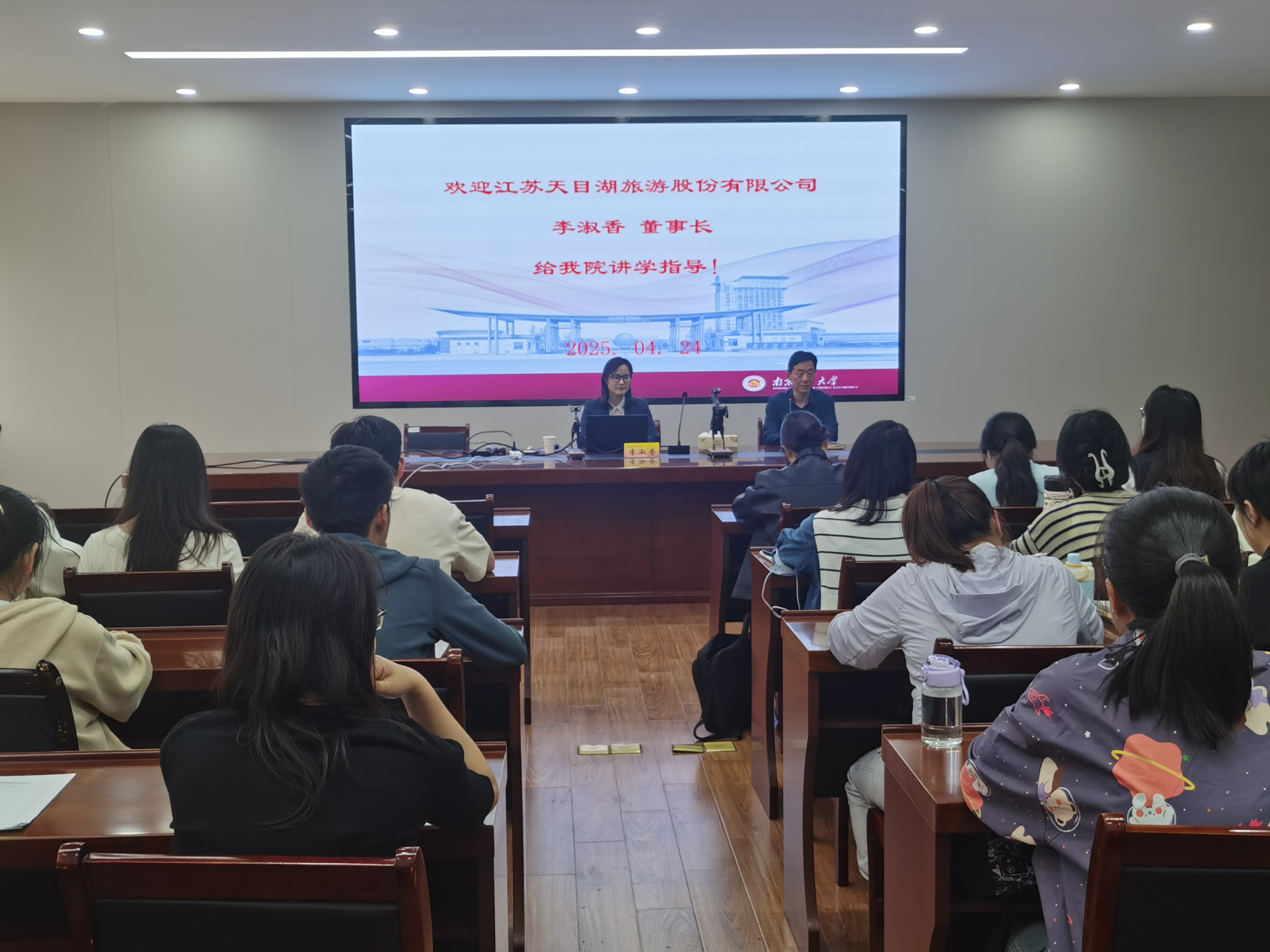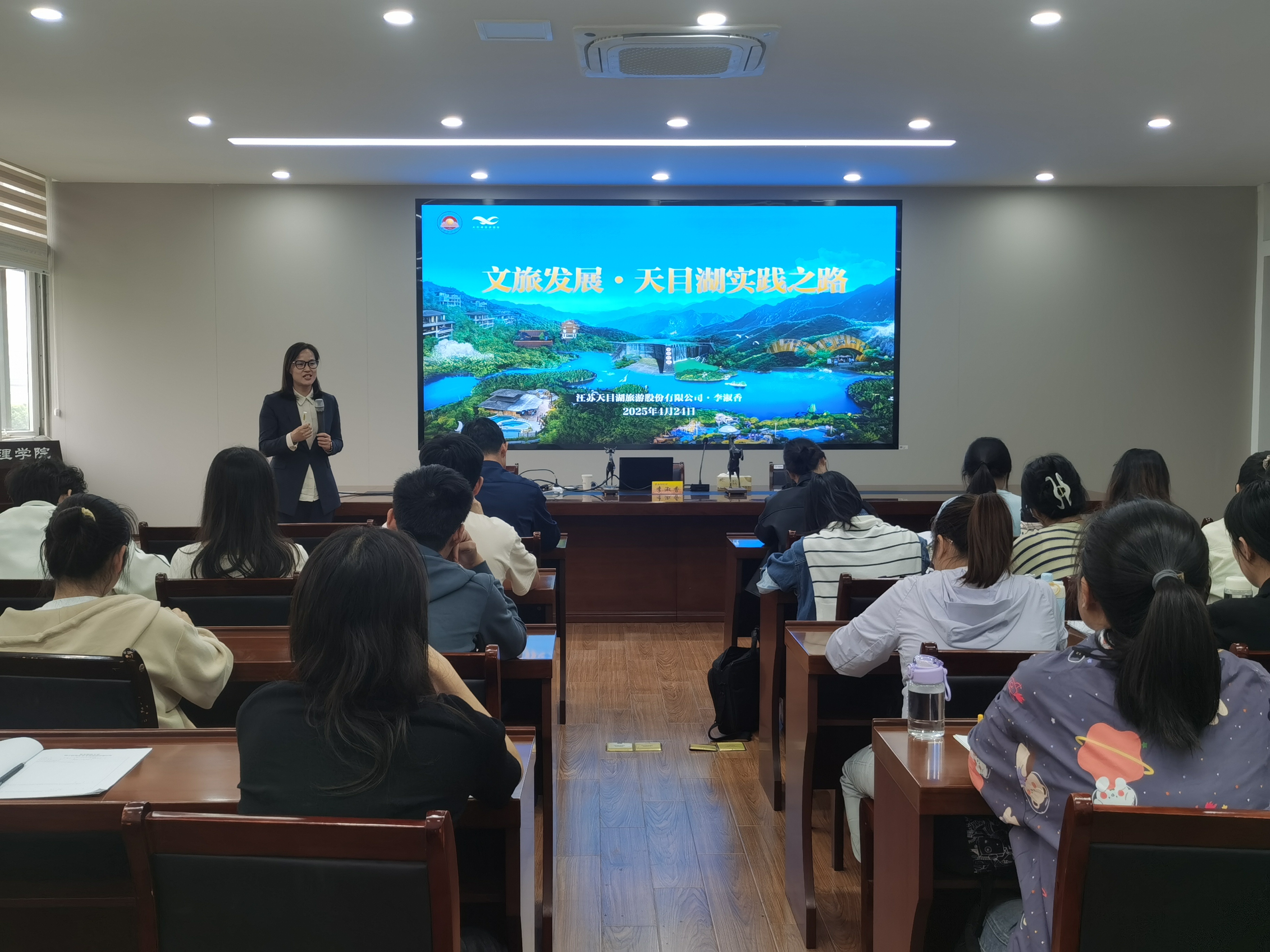 特邀江苏天目湖旅游股份有限公司董事长李淑香在德济楼408会议室开展专题讲座。本次讲座以“文旅发展 天目湖实践之路”为主题,院长万绪才主持,学院教师代表及全体研究生共同参与。